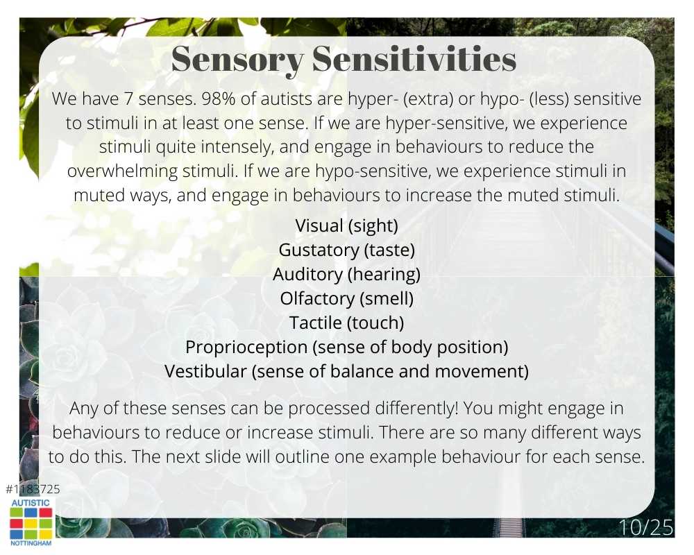 We have 7 senses. 98% of autists are hyper- (extra) or hypo- (less) sensitive to stimuli in at least one sense. If we are hyper-sensitive, we experience stimuli quite intensely, and engage in behaviours to reduce the overwhelming stimuli. If we are hypo-sensitive, we experience stimuli in muted ways, and engage in behaviours to increase the muted stimuli.