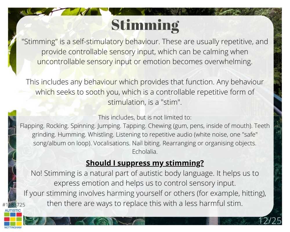 “Stimming” is a self-stimulatory behaviour. These are usually repetitive, and provide controllable sensory input, which can be calming when uncontrollable sensory input or emotion becomes overwhelming.