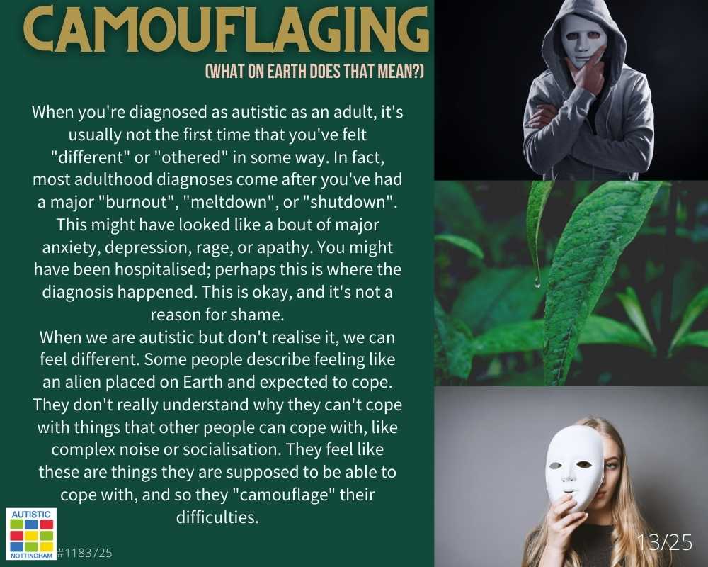 When we are autistic but don’t realise it, we can feel different. Some people describe feeling like an alien placed on Earth and expected to cope. They don’t really understand why they can’t cope with things that other people can cope with, like complex noise or socialisation. They feel like these are things they are supposed to be able to cope with, and so they “camouflage” their difficulties.