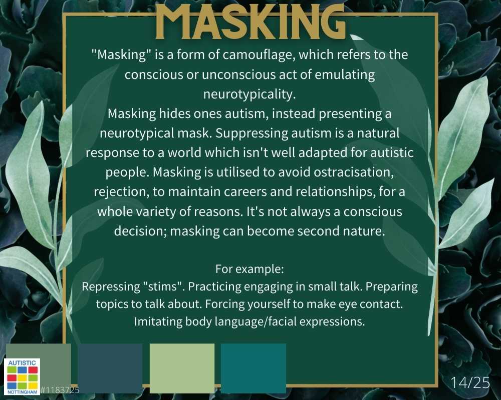 “Masking” is a form of camouflage, which refers to the conscious or unconscious act of emulating neurotypicality.