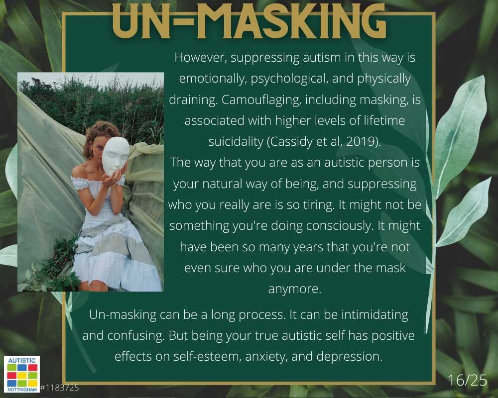 However, suppressing autism in this way is emotionally, psychological, and physically draining. Camouflaging, including masking, is associated with higher levels of lifetime suicidality (Cassidy et al, 2019).