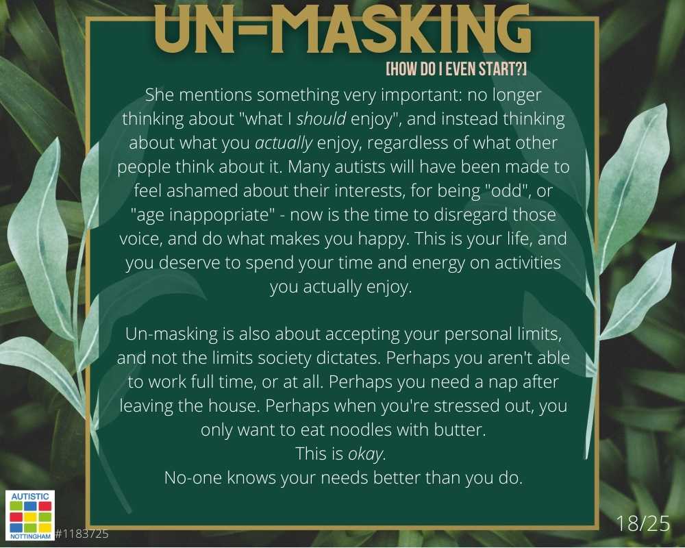 Un-masking is also about accepting your personal limits, and not the limits society dictates. Perhaps you aren’t able to work full time, or at all. Perhaps you need a nap after leaving the house. Perhaps when you’re stressed out, you only want to eat noodles with butter.
