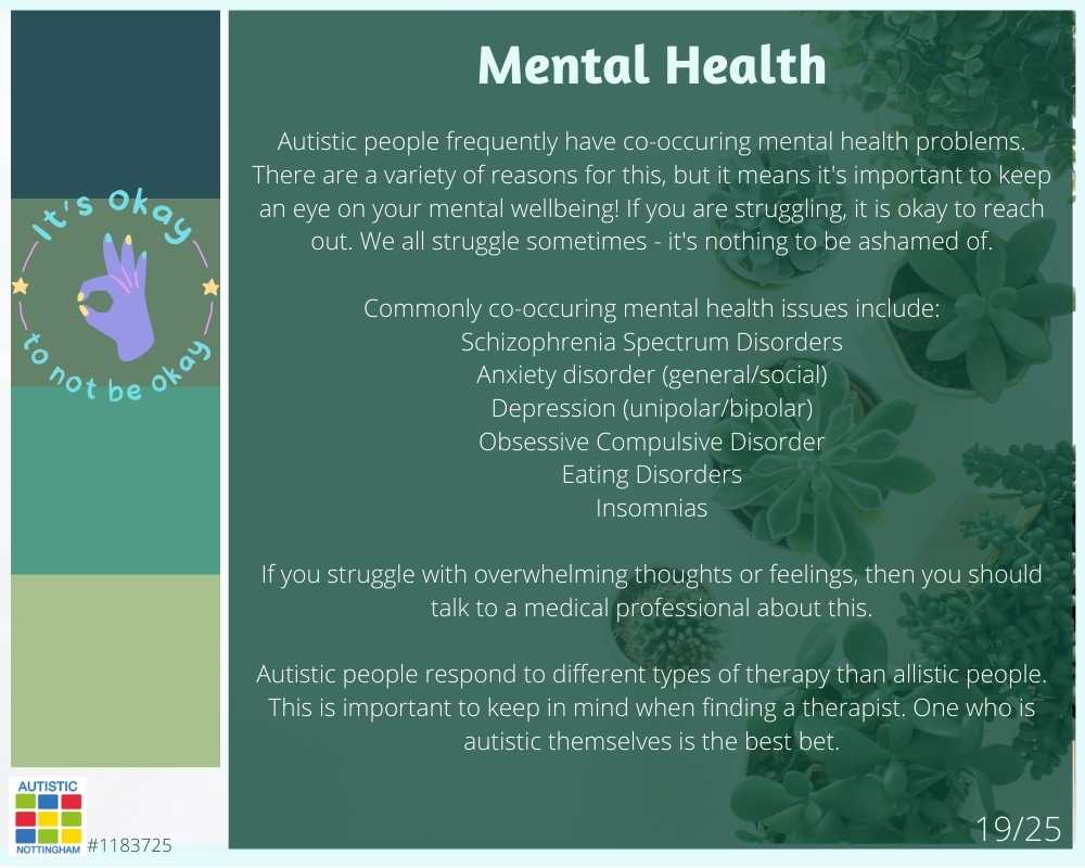 Autistic people frequently have co-occuring mental health problems. There are a variety of reasons for this, but it means it’s important to keep an eye on your mental wellbeing! If you are struggling, it is okay to reach out. We all struggle sometimes – it’s nothing to be ashamed of.