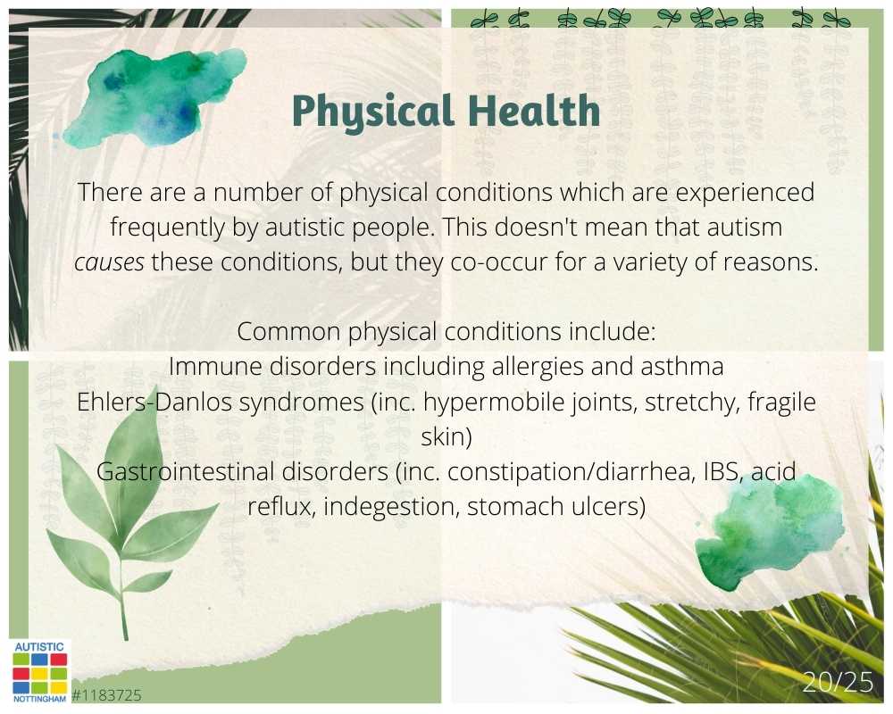 There are a number of physical conditions which are experienced frequently by autistic people. This doesn’t mean that autism causes these conditions, but they co-occur for a variety of reasons.