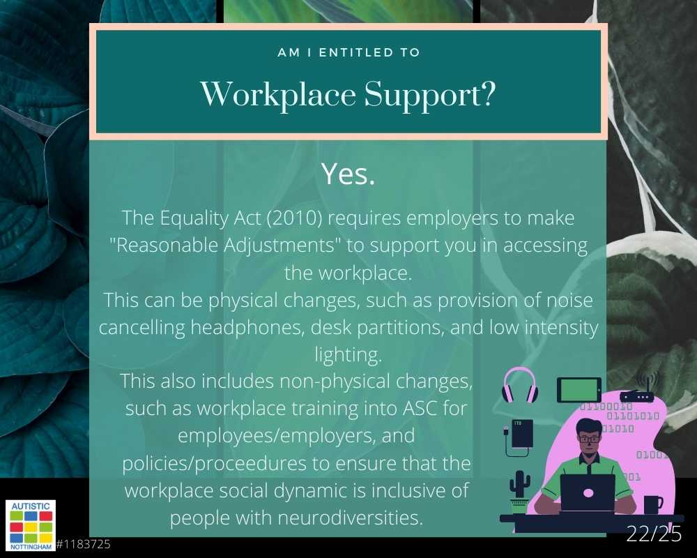 This also includes non-physical changes, such as workplace training into ASC for employees/employers, and policies/procedures to ensure that the workplace social dynamic is inclusive of people with neurodiversities.