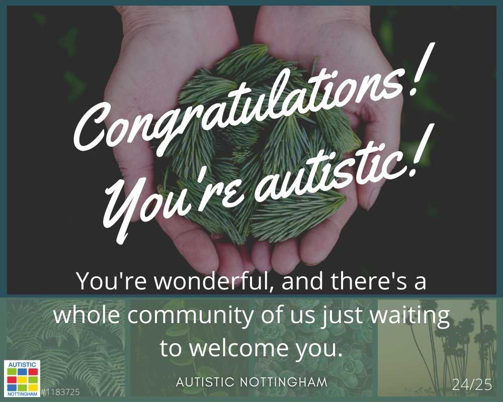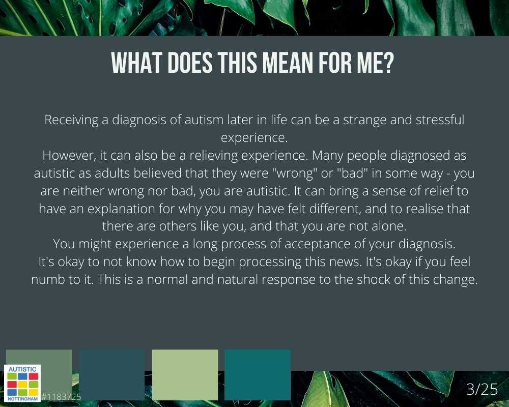 However, it can also be a relieving experience. Many people diagnosed as autistic as adults believed that they were “wrong” or “bad” in some way – you are neither wrong nor bad, you are autistic. It can bring a sense of relief to have an explanation for why you may have felt different, and to realise that there are others like you, and that you are not alone.
