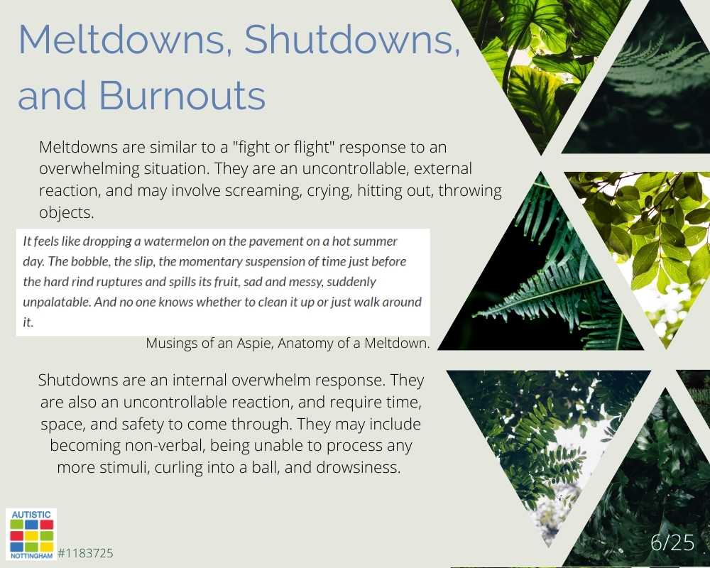 While a meltdown or shutdown is more of a short-term process, which is typically recovered from in a matter of days, burnout is a result of chronic cumulative stress of navigating a world desgined for allistic people.