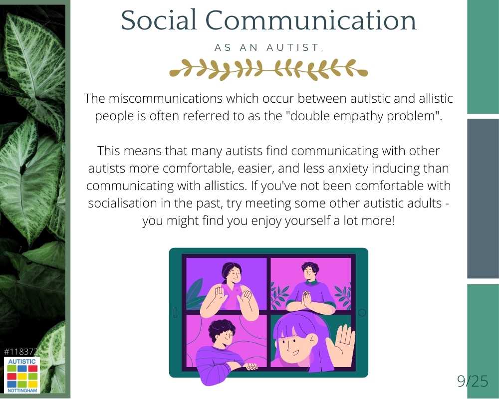 This means that many autists find communicating with other autists more comfortable, easier, and less anxiety inducing than communicating with allistics. If you’ve not been comfortable with socialisation in the past, try meeting some other autistic adults – you might find you enjoy yourself a lot more!