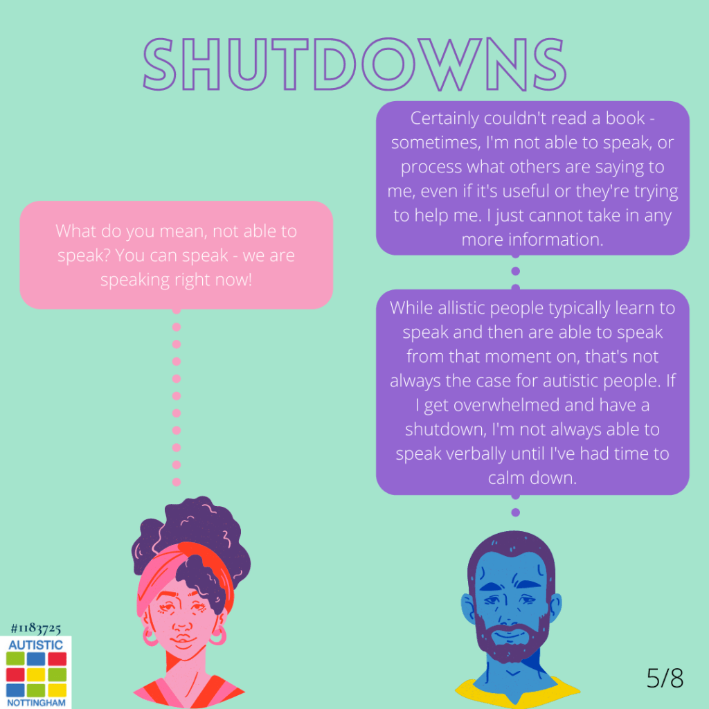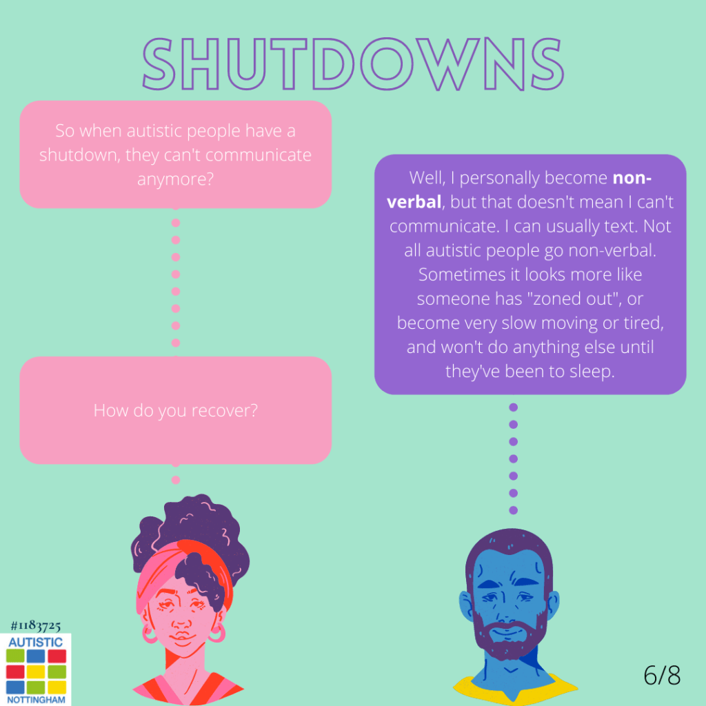 Shutdowns Posted byautisticnottinghamDecember 8, 2020March 8, 2023Posted inBurnout & MeltdownsTags:actuallyautistic, autism, autisticadult, shutdowns Share this: Click to share on X (Opens in new window) X Click to share on Facebook (Opens in new window) Facebook Like Loading... Related