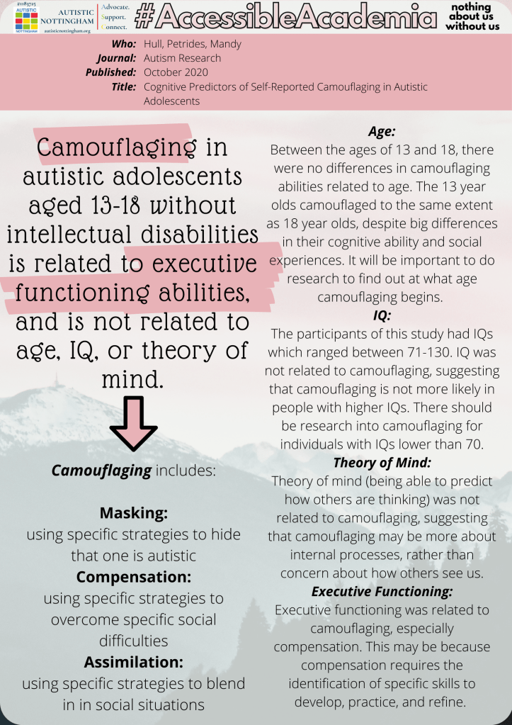 Camouflaging in autistic adolescents aged 13-18 without intellectual disabilities is related to executive functioning abilities, and is not related to age, IQ, or theory of mind.