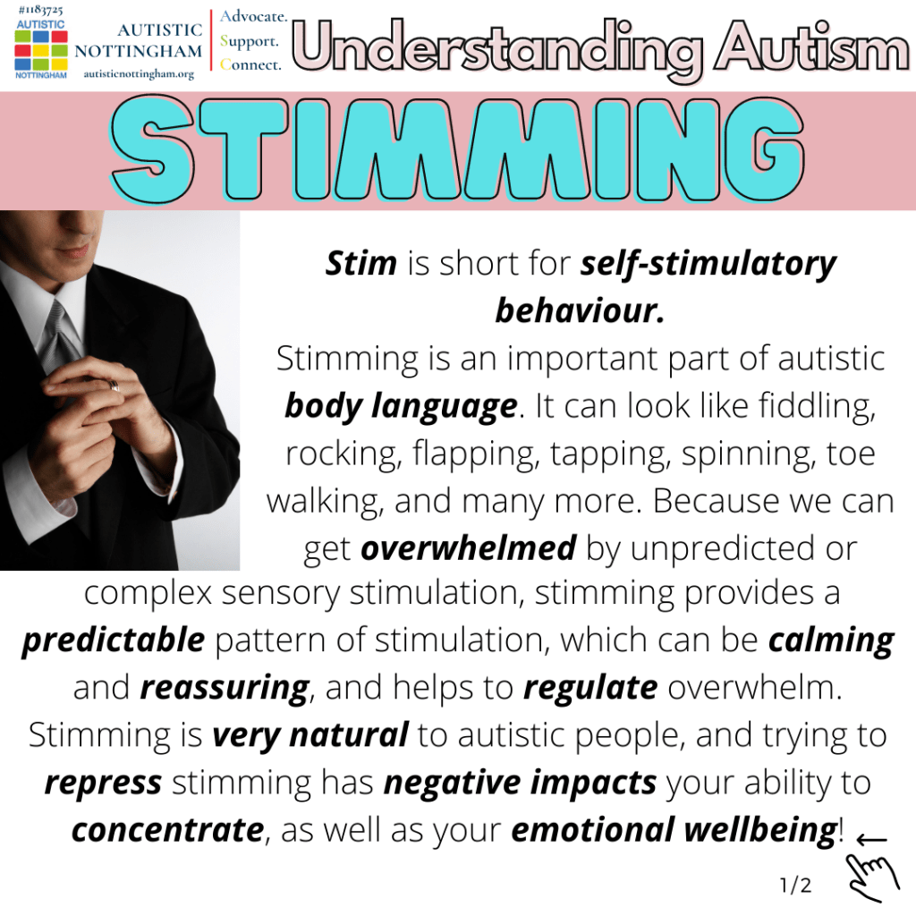 Stimming is an important part of autistic body language. It can look like fiddling, rocking, flapping, tapping, spinning, toe walking, and many more. Because we can get overwhelmed by unpredicted or complex sensory stimulation, stimming provides a predictable pattern of stimulation, which can be calming and reassuring, and helps to regulate overwhelm.