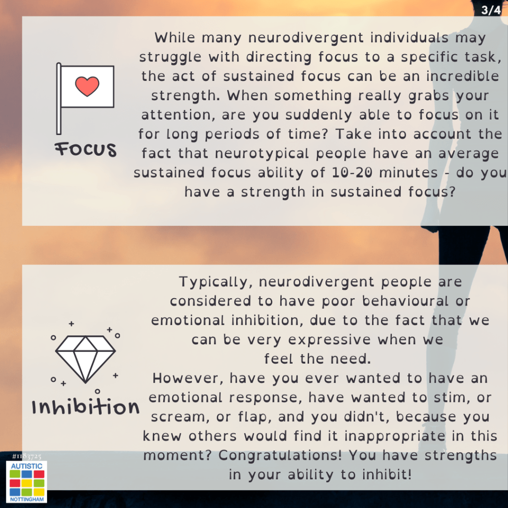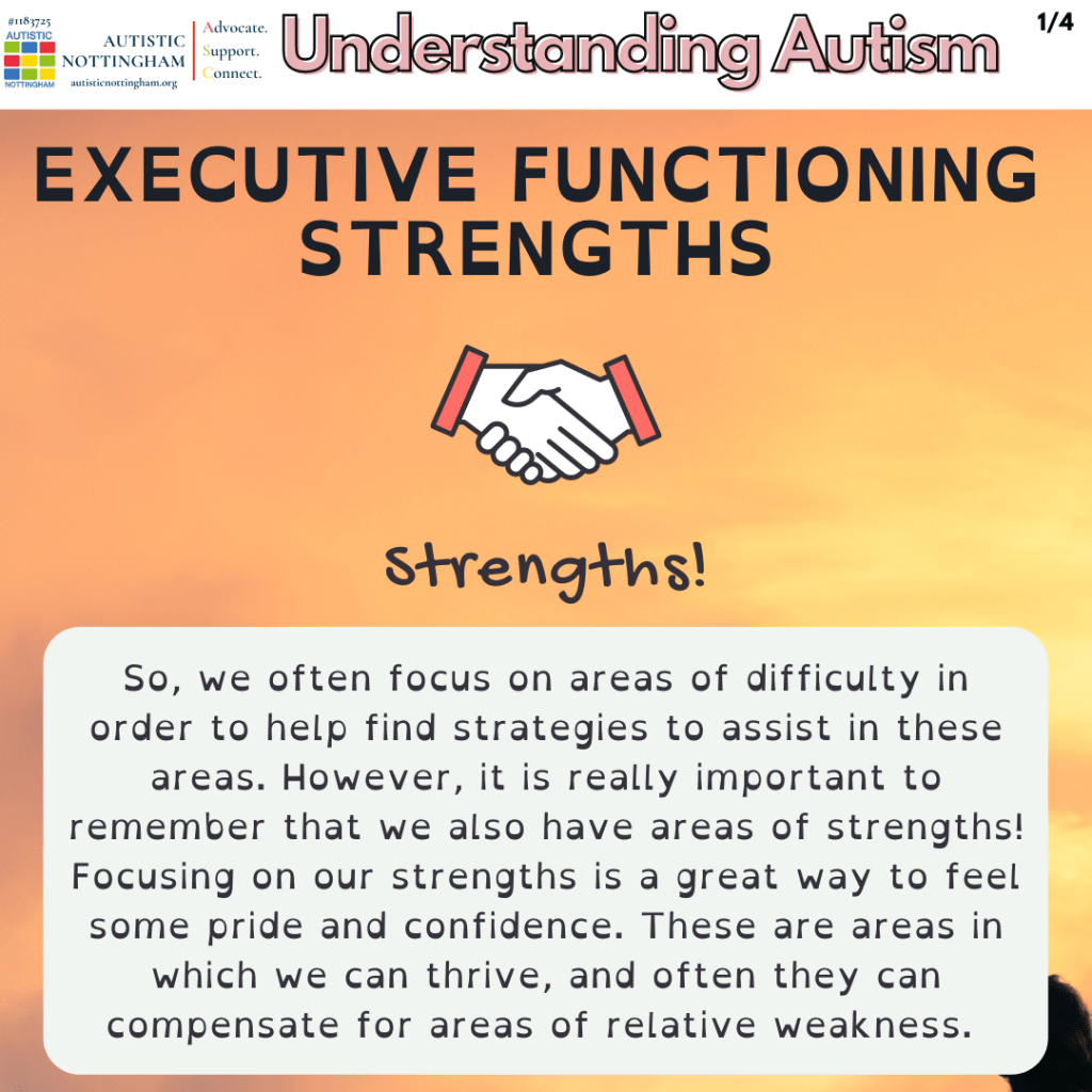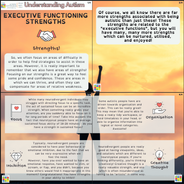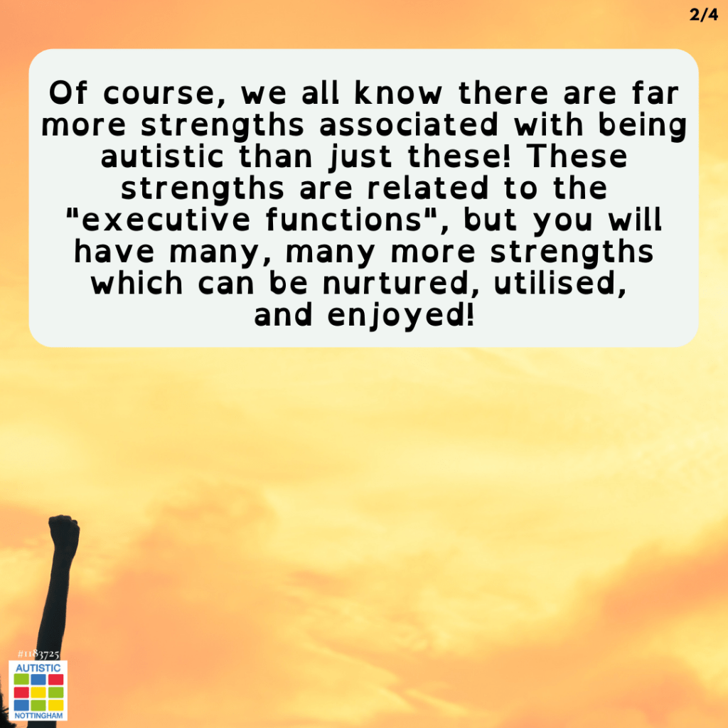 Of course, we all know there are far more strengths associated with being autistic than just these! These strengths are related to the “executive functions”, but you will have many, many more strengths which can be nurtured, utilised, and enjoyed!