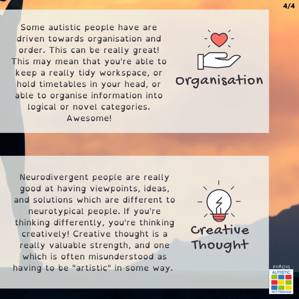 Neurodivergent people are really good at having viewpoints, ideas, and solutions which are different to neurotypical people. If you’re thinking differently, you’re thinking creatively! Creative thought is a really valuable strength, and one which is often misunderstood as having to be “artistic” in some way.