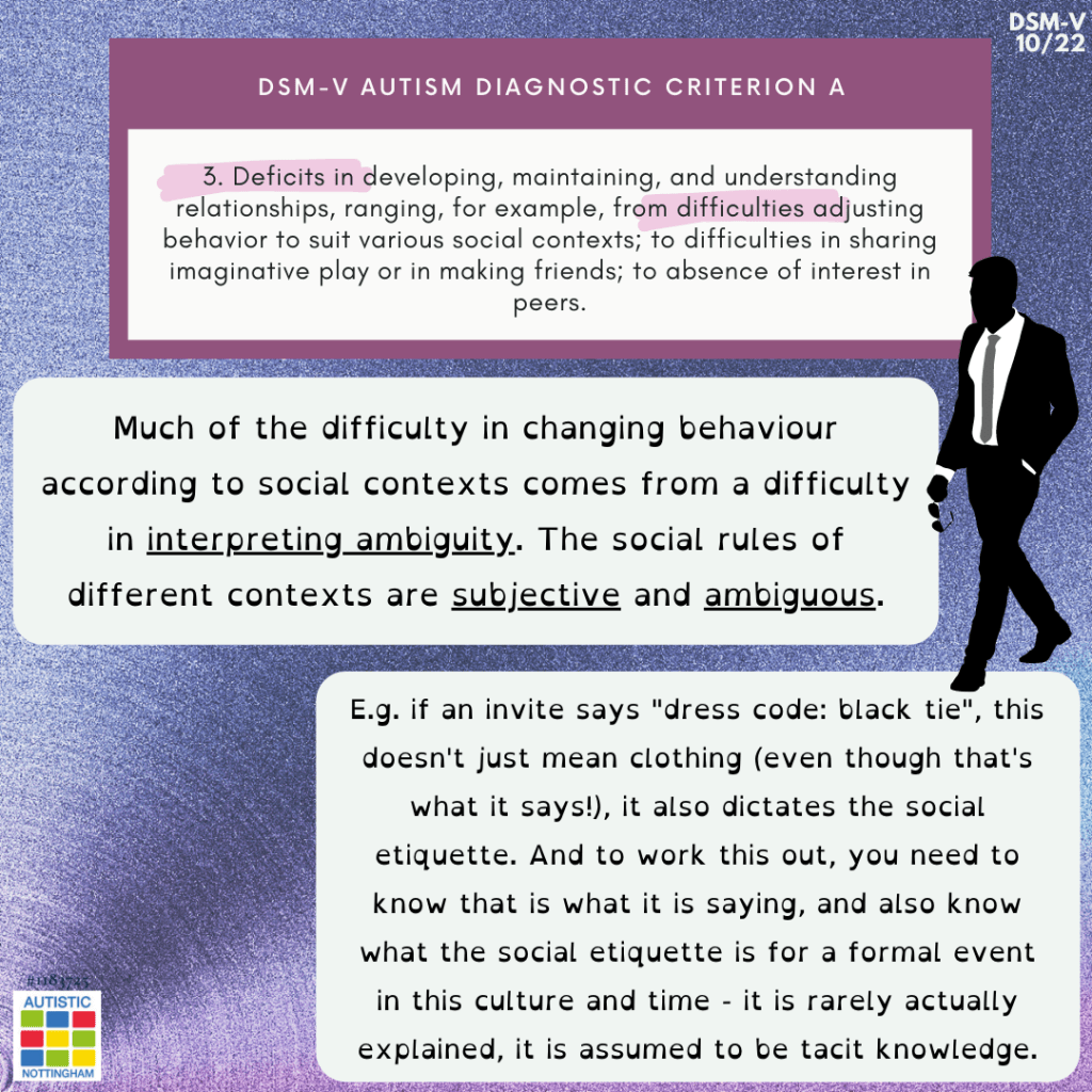 Much of the difficulty in changing behaviour according to social contexts comes from a difficulty in interpreting ambiguity. The social rules of different contexts are subjective and ambiguous.