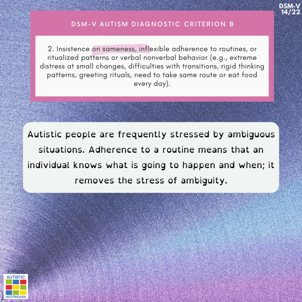 Autistic people are frequently stressed by ambiguous situations. Adherence to a routine means that an individual knows what is going to happen and when; it removes the stress of ambiguity.