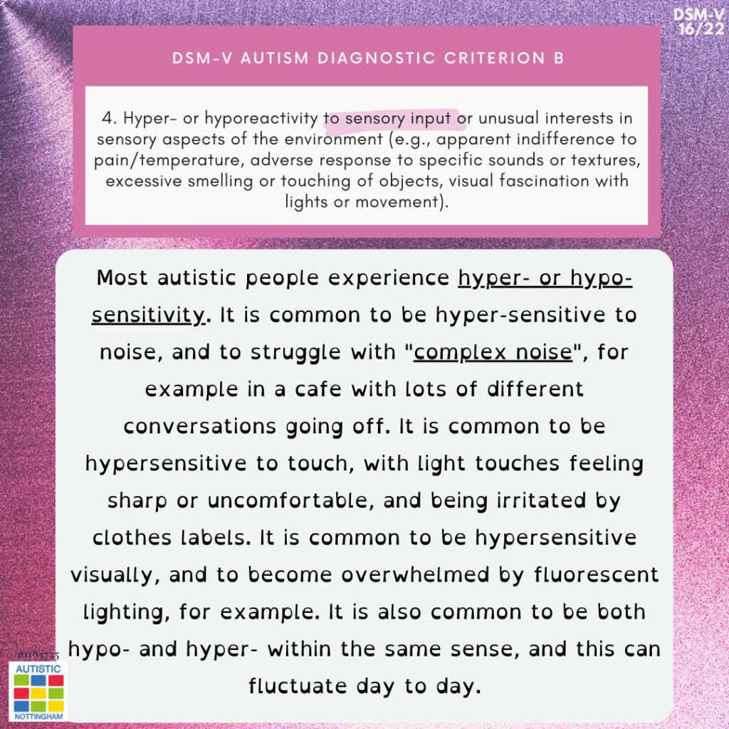 Most autistic people experience hyper- or hypo-sensitivity. It is common to be hyper-sensitive to noise, and to struggle with “complex noise”, for example in a cafe with lots of different conversations going off. It is common to be hypersensitive to touch, with light touches feeling sharp or uncomfortable, and being irritated by clothes labels. It is common to be hypersensitive visually, and to become overwhelmed by fluorescent lighting, for example. It is also common to be both hypo- and hyper- within the same sense, and this can fluctuate day to day.