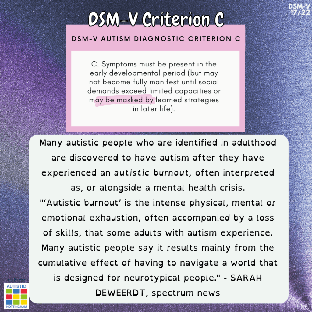 “‘Autistic burnout’ is the intense physical, mental or emotional exhaustion, often accompanied by a loss of skills, that some adults with autism experience. Many autistic people say it results mainly from the cumulative effect of having to navigate a world that is designed for neurotypical people.” – Sarah Deweerdt, Spectrum News