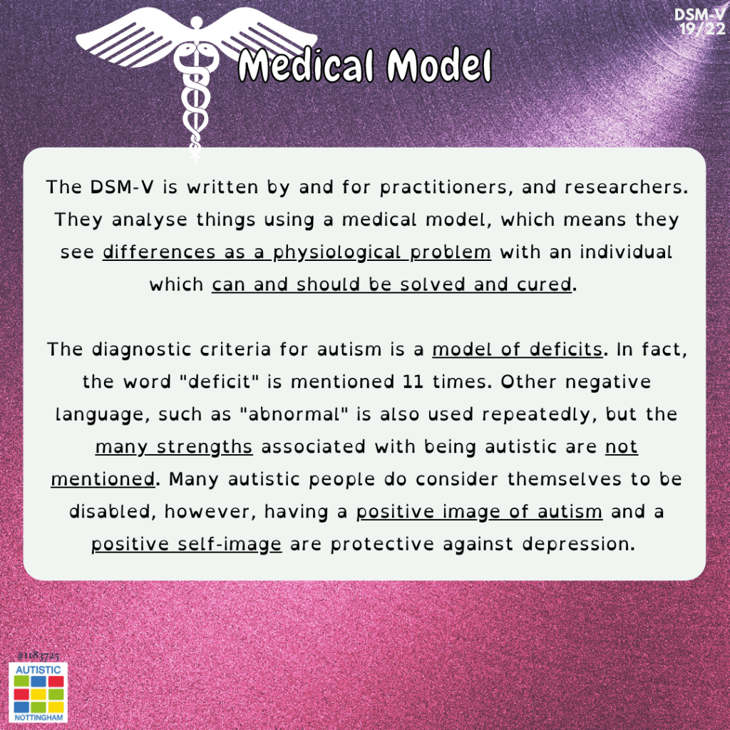 The DSM-V is written by and for practitioners, and researchers. They analyse things using a medical model, which means they see differences as a physiological problem with an individual which can and should be solved and cured.