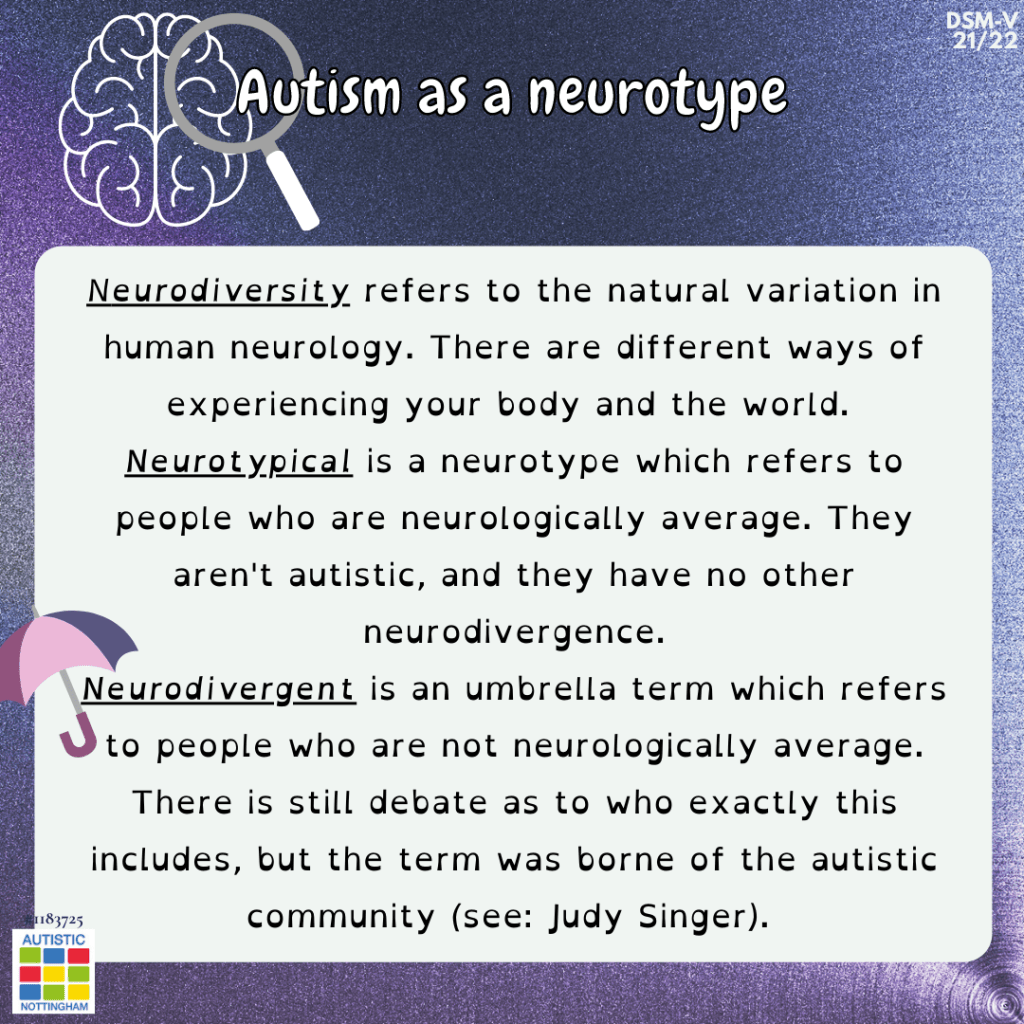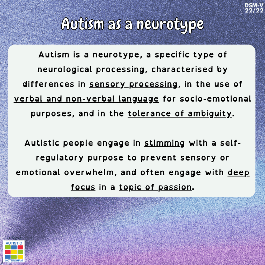 Autism is a neurotype, a specific type of neurological processing, characterised by differences in sensory processing, in the use of verbal and non-verbal language for socio-emotional purposes, and in the tolerance of ambiguity.