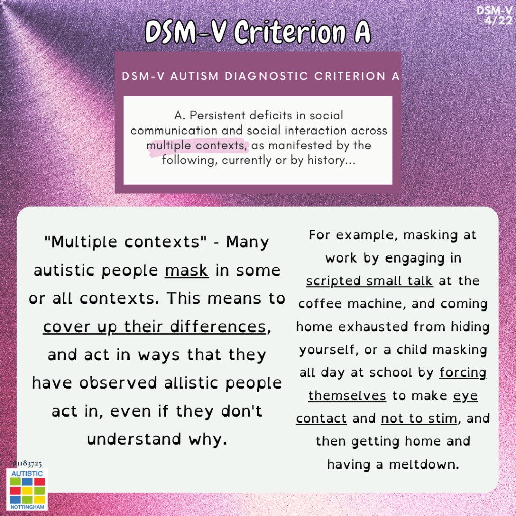 “Multiple contexts” – Many autistic people mask in some or all contexts. This means to cover up their differences, and act in ways that they have observed allistic people act in, even if they don’t understand why.