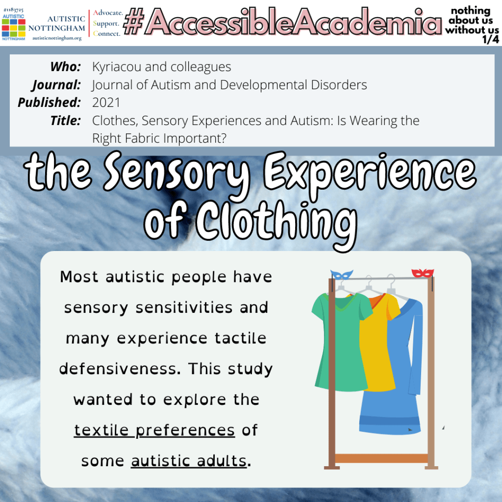 Most autistic people have sensory sensitivities and many experience tactile defensiveness. This study wanted to explore the textile preferences of some autistic adults.