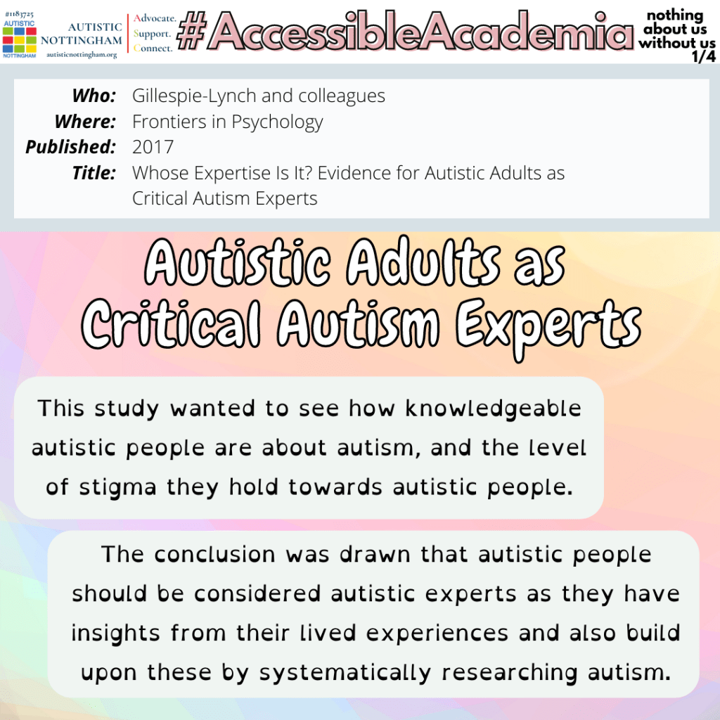 This study wanted to see how knowledgeable autistic people are about autism, and the level of stigma they hold towards autistic people. The conclusion was drawn that autistic people should be considered autistic experts as they have insights from their lived experiences and also build upon these by systematically researching autism.