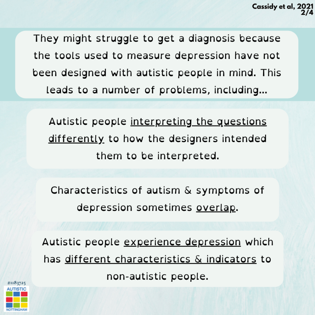 They might struggle to get a diagnosis because the tools used to measure depression have not been designed with autistic people in mind. This leads to a number of problems, including…