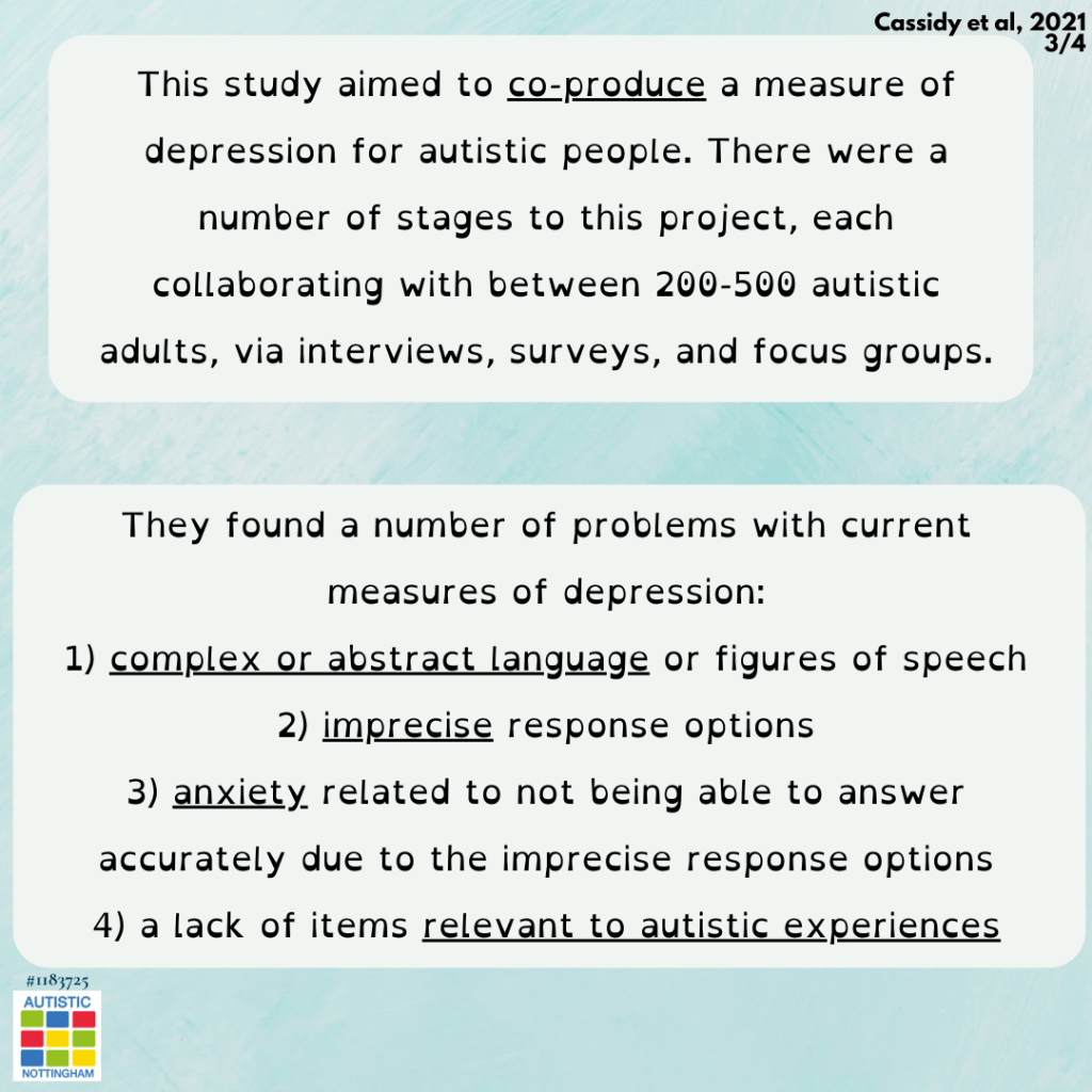 This study aimed to co-produce a measure of depression for autistic people. There were a number of stages to this project, each collaborating with between 200-500 autistic adults, via interviews, surveys, and focus groups.