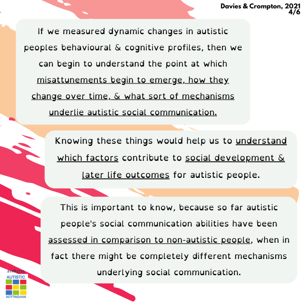 We don’t yet know the specifics of autistic interaction, but this knowledge would be really important for reframing our understanding of autism & will contribute to the progression of the rights of autistic people.
