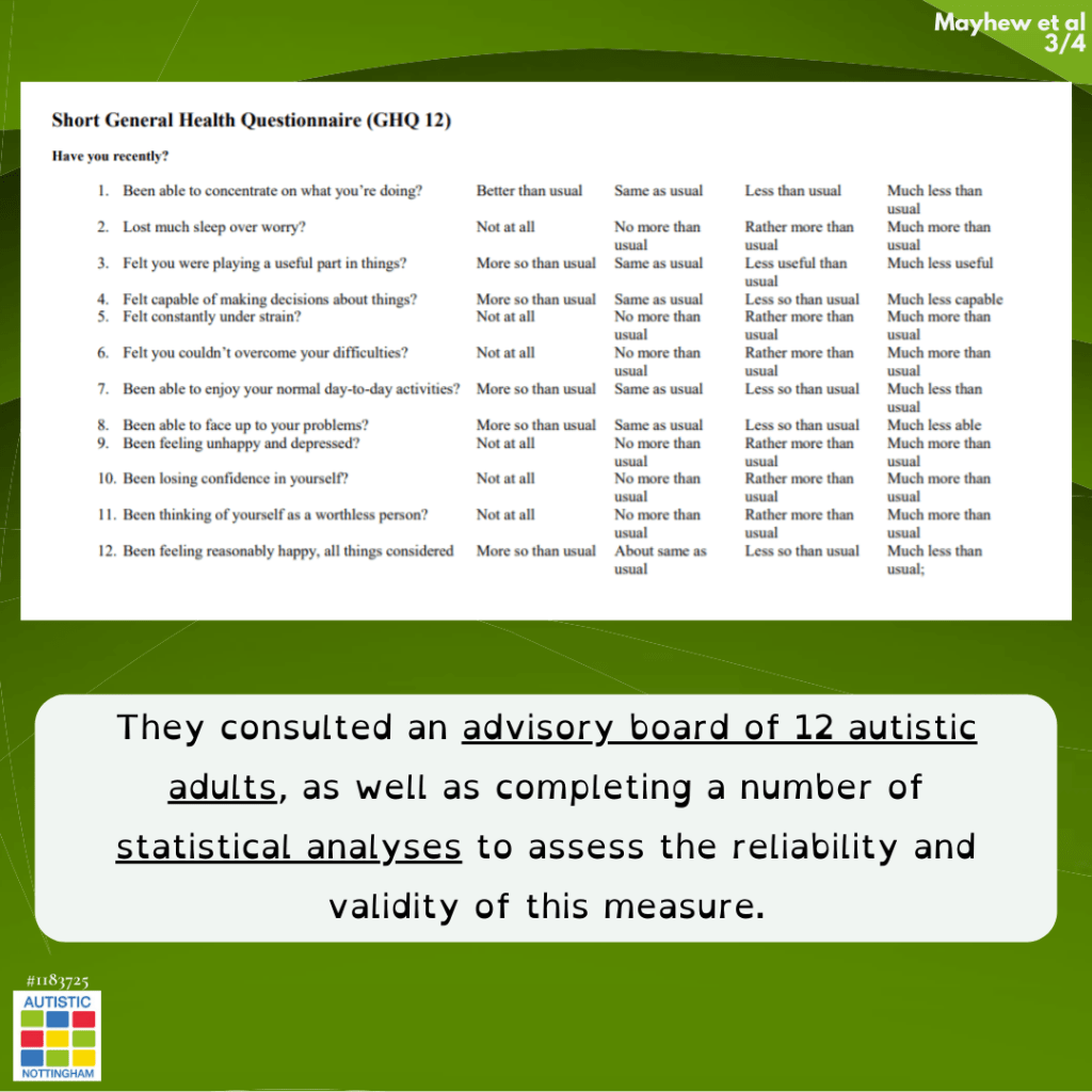 This study wanted to assess whether the 12 question General Health Questionnaire (GHQ-12) is reliable and valid for use with autistic populations.