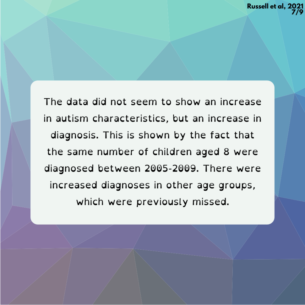 The data did not seem to show an increase in autism characteristics, but an increase in diagnosis. This is shown by the fact that the same number of children aged 8 were diagnosed between 2005-2009. There were increased diagnoses in other age groups, which were previously missed.