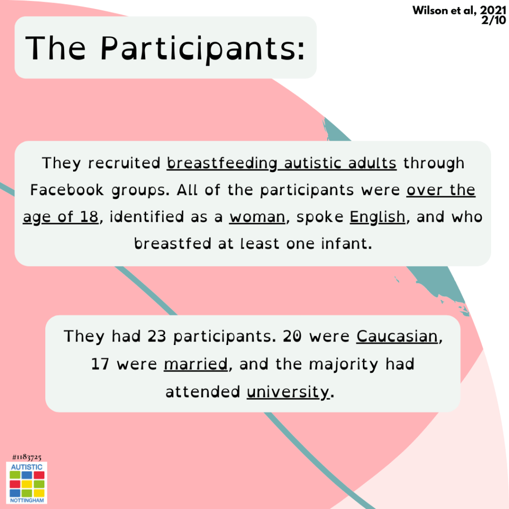 They recruited breastfeeding autistic adults through Facebook groups. All of the participants were over the age of 18, identified as a woman, spoke English, and who breastfed at least one infant.
