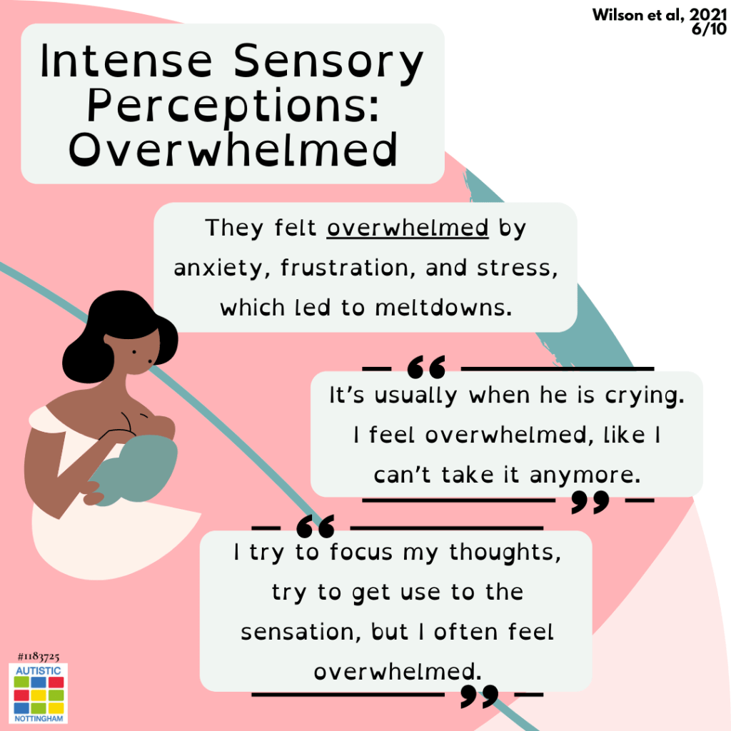 All participants reported breastfeeding as overstimulating, leading to discomfort & extreme irritability. Milk let-down (release), infant sounds, and sucking sensations were very overstimulating, and many described it as “sensory weirdness”.