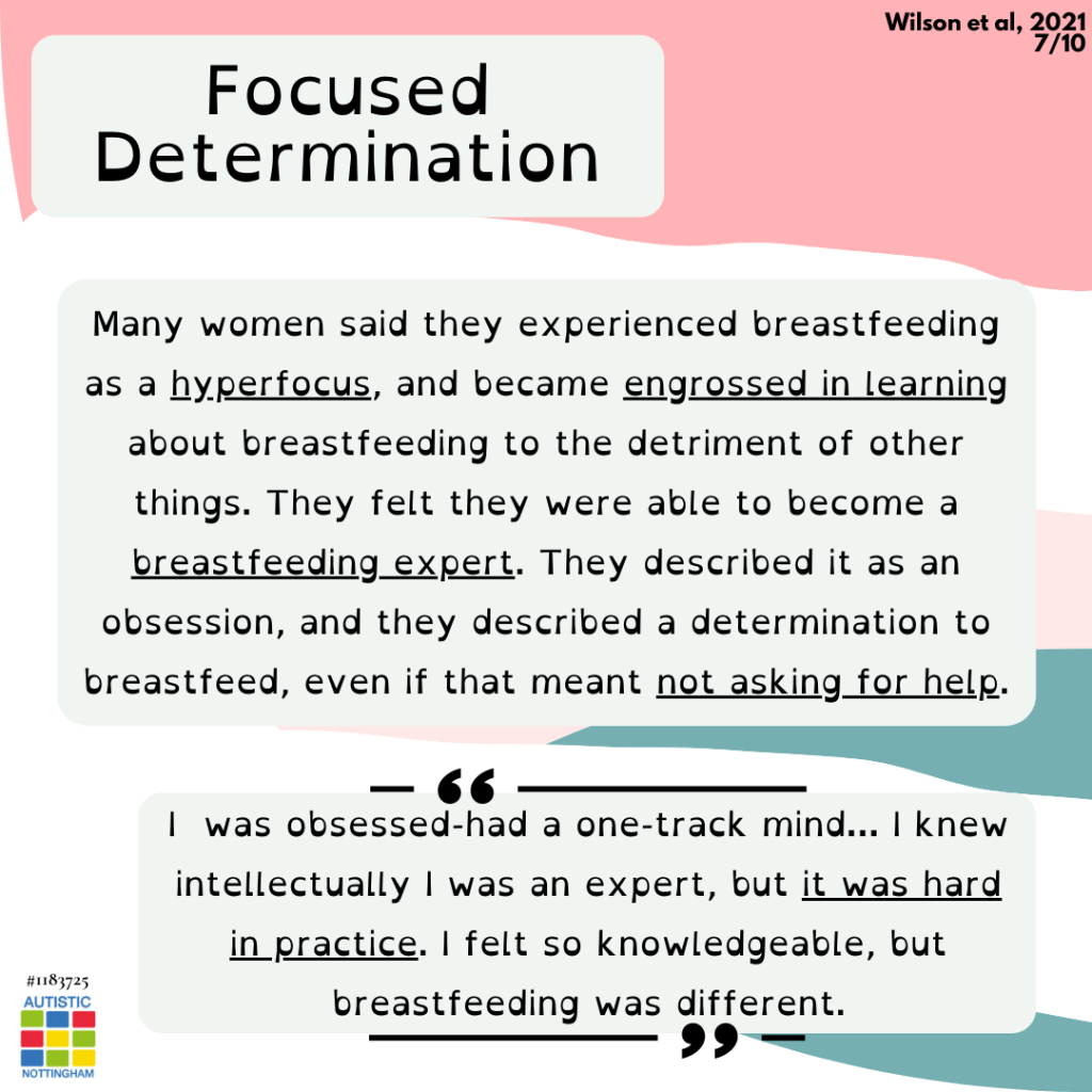 Many women said they experienced breastfeeding as a hyperfocus, and became engrossed in learning about breastfeeding to the detriment of other things. They felt they were able to become a breastfeeding expert. They described it as an obsession, and they described a determination to breastfeed, even if that meant not asking for help.