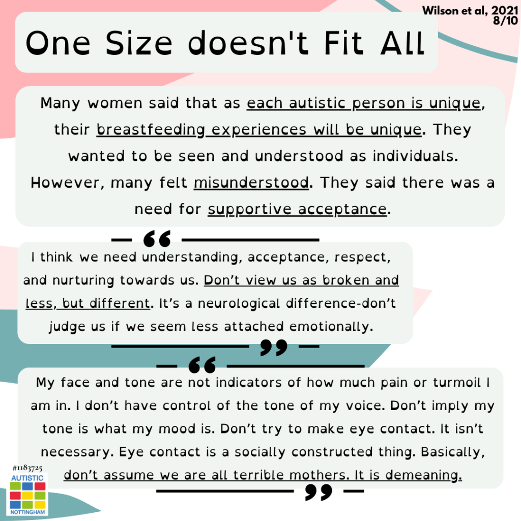 Many women said that as each autistic person is unique, their breastfeeding experiences will be unique. They wanted to be seen and understood as individuals. However, many felt misunderstood. They said there was a need for supportive acceptance.