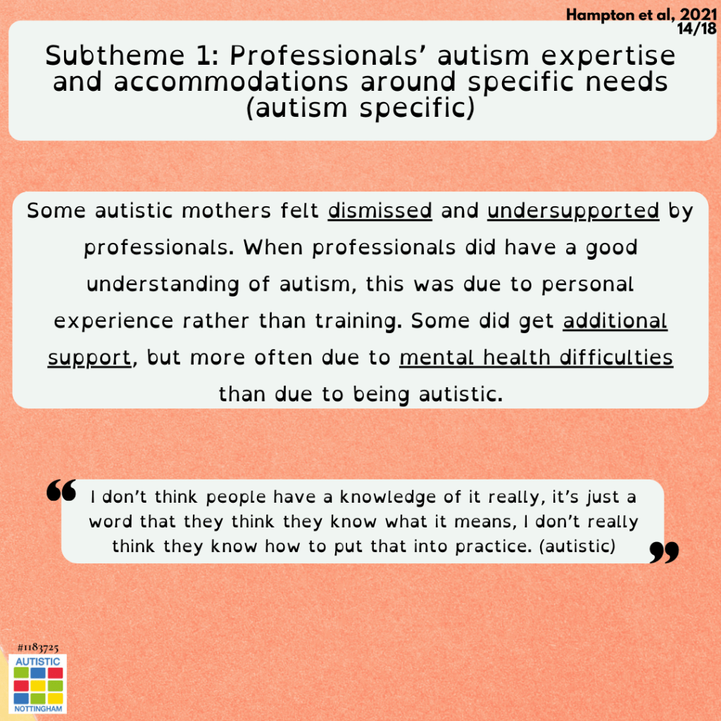 Some autistic mothers felt dismissed and undersupported by professionals. When professionals did have a good understanding of autism, this was due to personal experience rather than training. Some did get additional support, but more often due to mental health difficulties than due to being autistic.