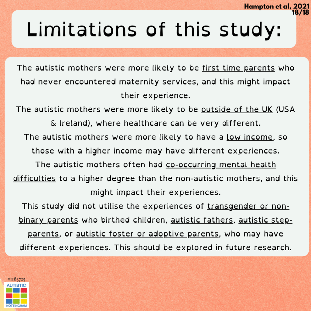 This study did not utilise the experiences of transgender or non-binary parents who birthed children, autistic fathers, autistic step-parents, or autistic foster or adoptive parents, who may have different experiences. This should be explored in future research.