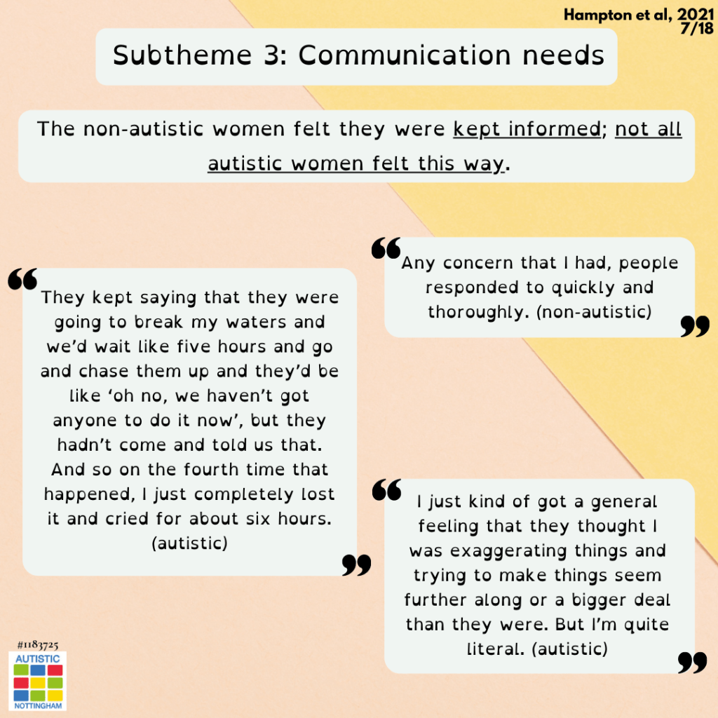 The autistic mothers were more likely to be first time parents who had never encountered maternity services, and this might impact their experience.