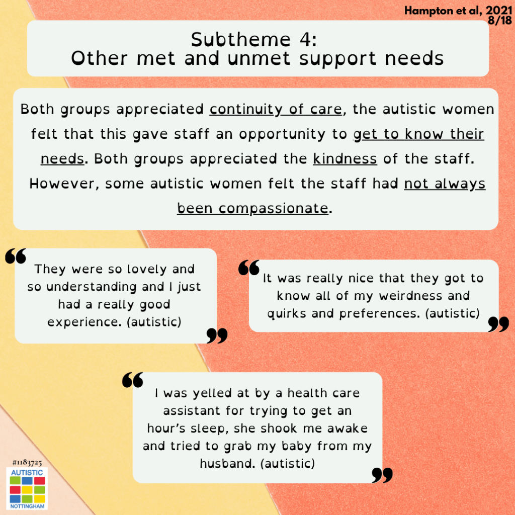 Both groups appreciated continuity of care, the autistic women felt that this gave staff an opportunity to get to know their needs. Both groups appreciated the kindness of the staff. However, some autistic women felt the staff had not always been compassionate.