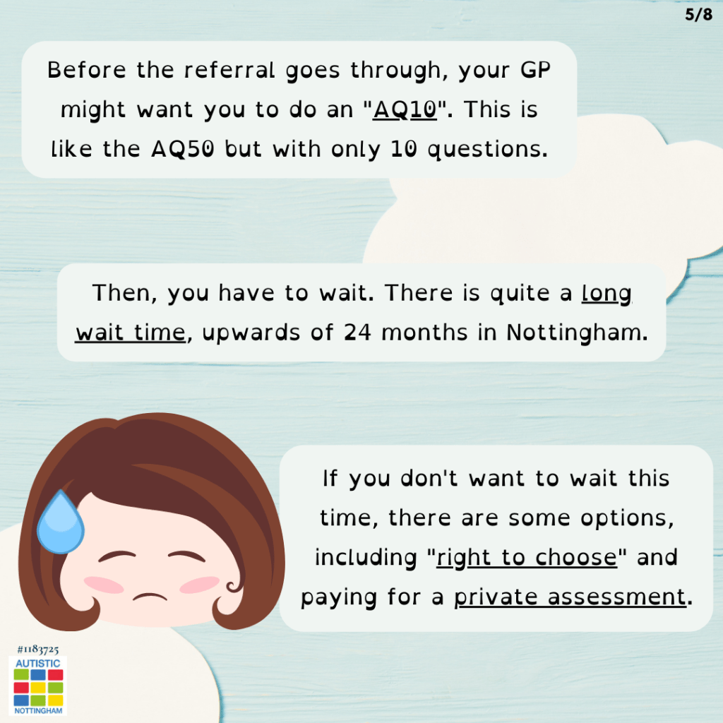 Before the referral goes through, your GP might want you to do an “AQ10”. This is like the AQ50 but with only 10 questions.