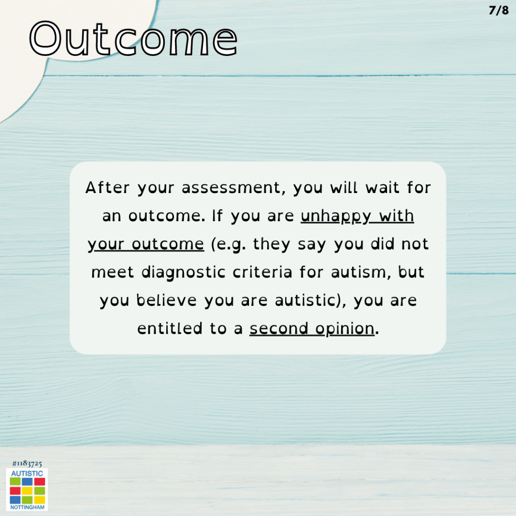 After your assessment, you will wait for an outcome. If you are unhappy with your outcome (e.g. they say you did not meet diagnostic criteria for autism, but you believe you are autistic), you are entitled to a second opinion.