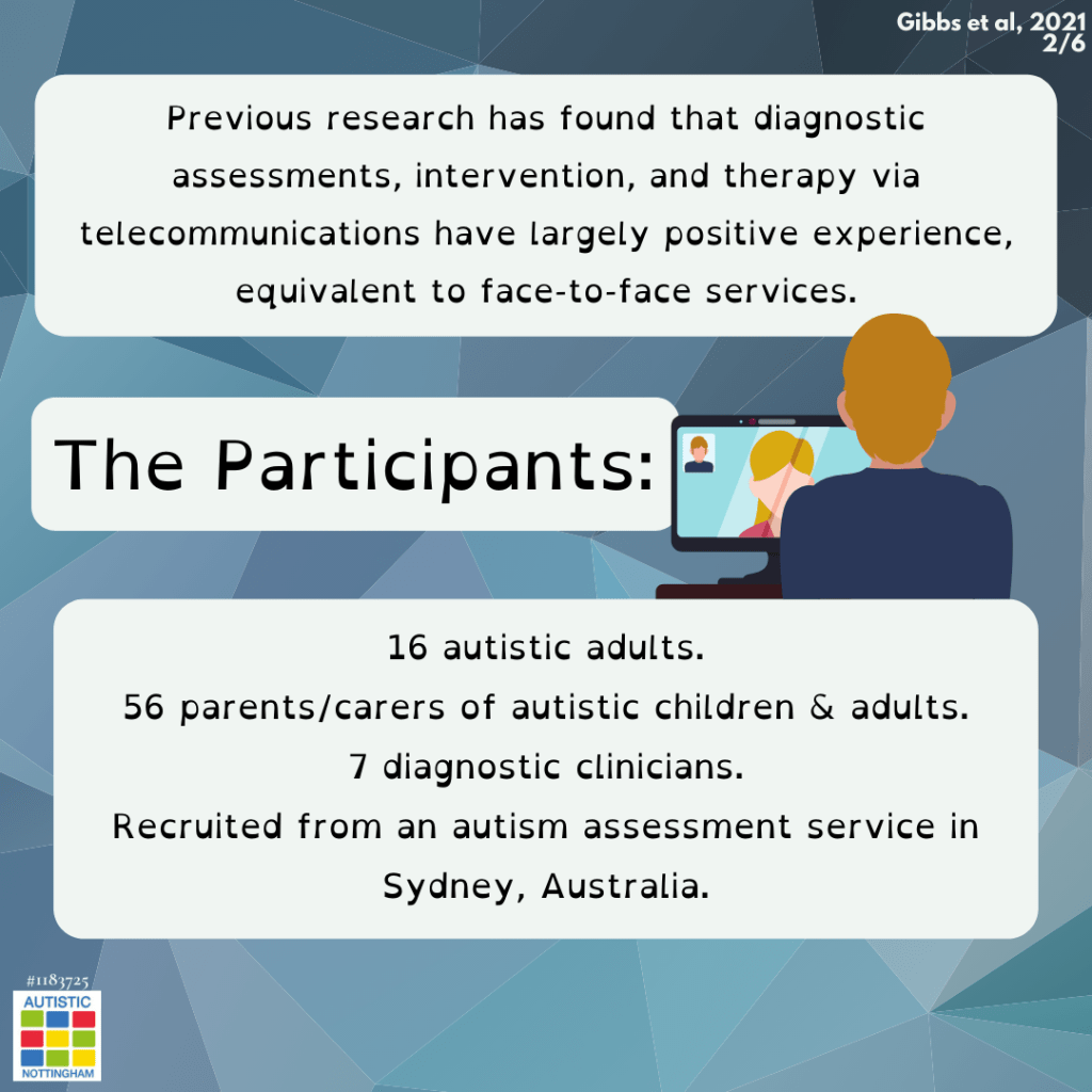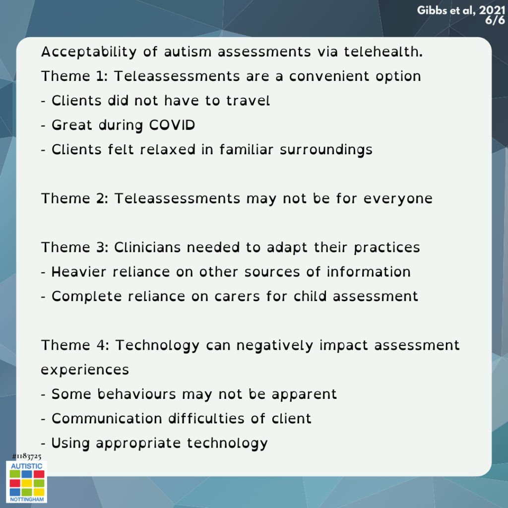 Previous research has found that diagnostic assessments, intervention, and therapy via telecommunications have largely positive experience, equivalent to face-to-face services.