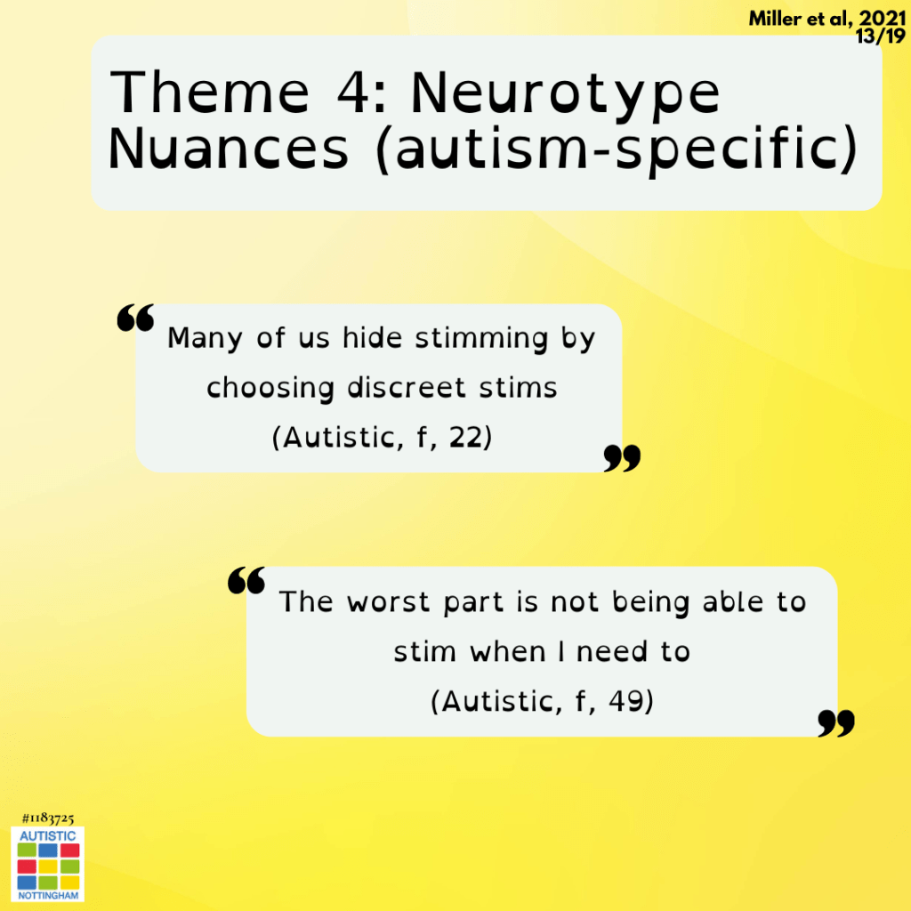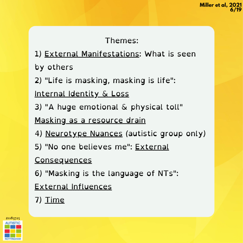 There were seven themes; only one was specific to autistic experiences (Neurotype Nuances). There seems to be a lot of overlap in experiences of masking in different groups.