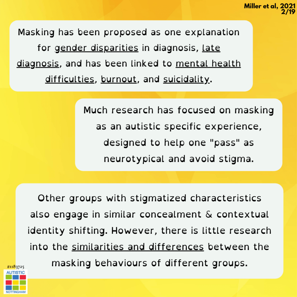 Much research has focused on masking as an autistic specific experience, designed to help one “pass” as neurotypical and avoid stigma.