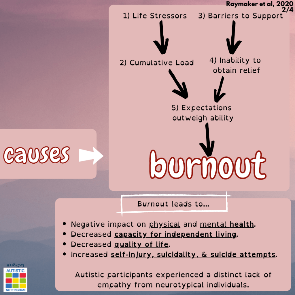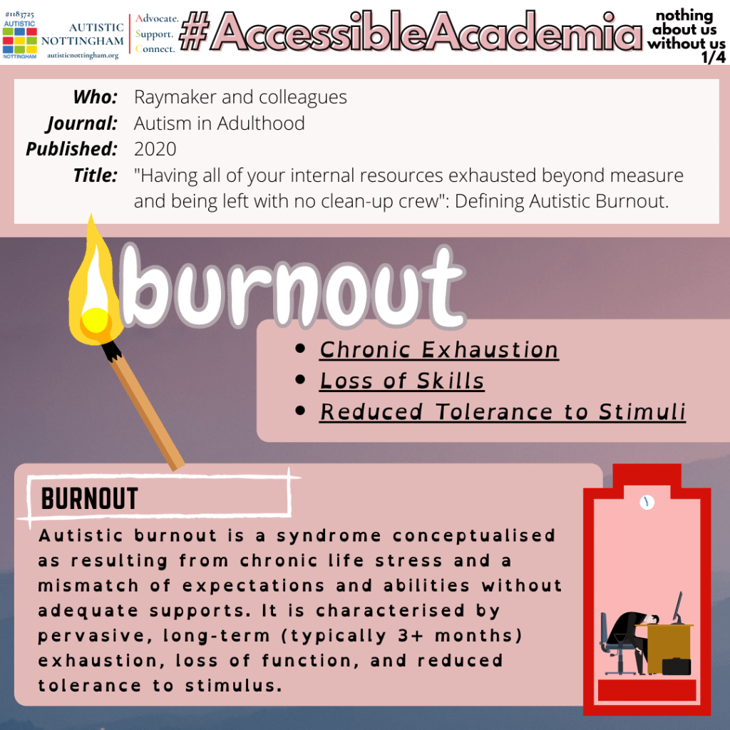Autistic burnout is a syndrome conceptualised as resulting from chronic life stress and a mismatch of expectations and abilities without adequate supports. It is characterised by pervasive, long-term (typically 3+ months) exhaustion, loss of function, and reduced tolerance to stimulus.