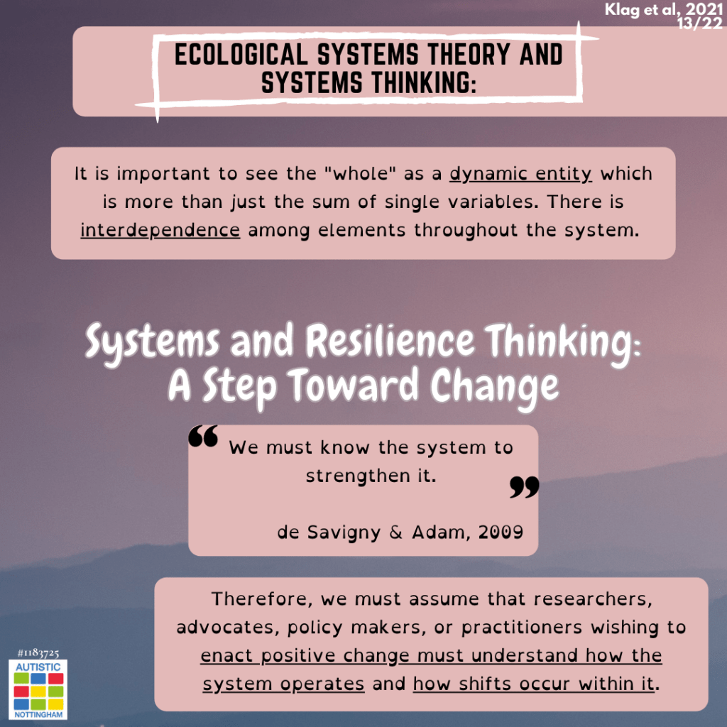 Resilience thinking calls for the questioning of & shared understanding of the history of the cultural & societal elements which underlie such systems. Many of these elements actually serve to exclude autistic people, and have contributed to the current systems.