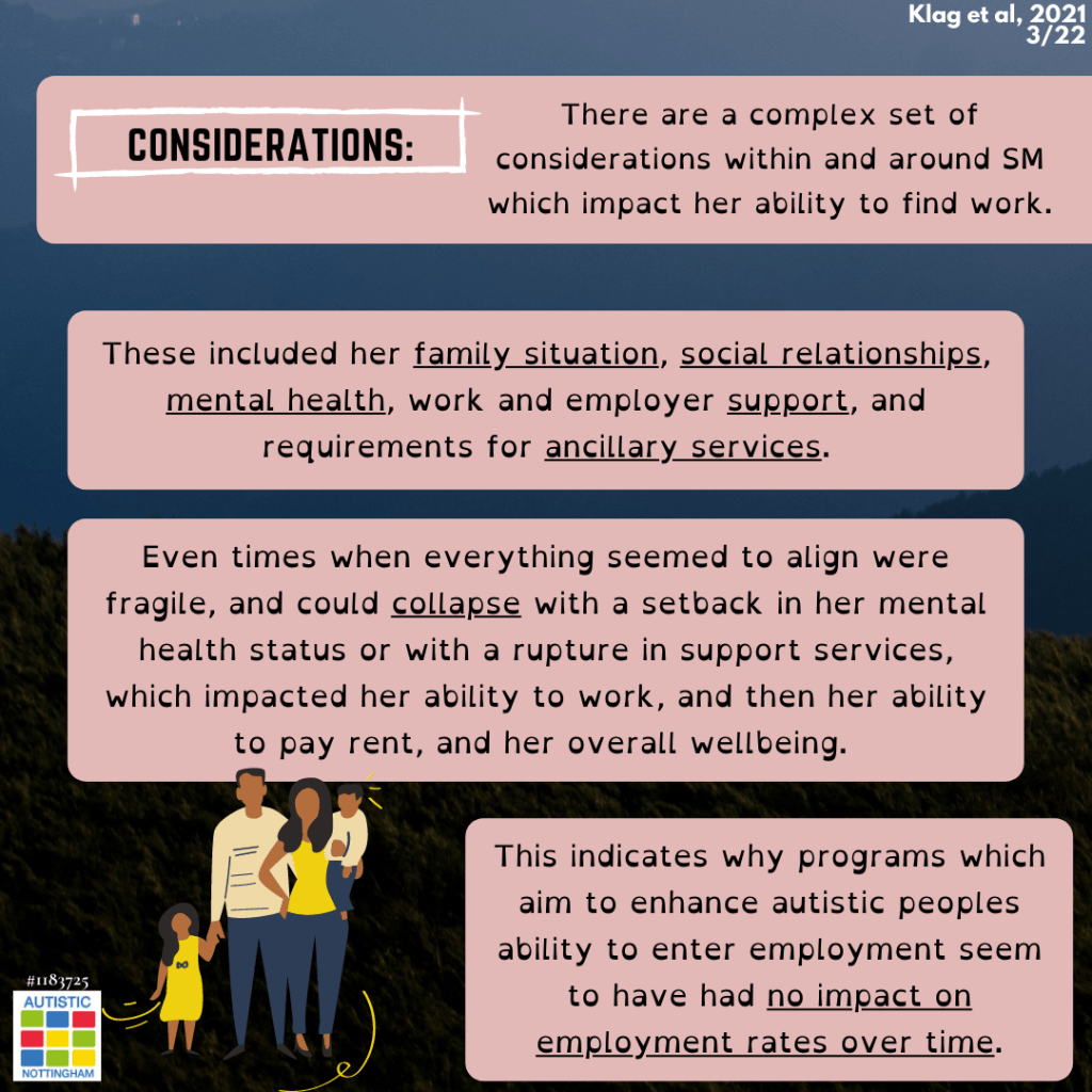 At the time of interview, SM was working part-time in a role she is overqualified for. She was also recovering from a period of burnout. She described periods of unemployment due to sensory sensitivities, being unable to fulfil a specific work schedule, & health problems. There are multiple factors which influence her ability to find and maintain work.