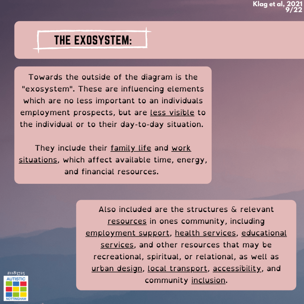 Towards the outside of the diagram is the “exosystem”. These are influencing elements which are no less important to an individuals employment prospects, but are less visible to the individual or to their day-to-day situation.