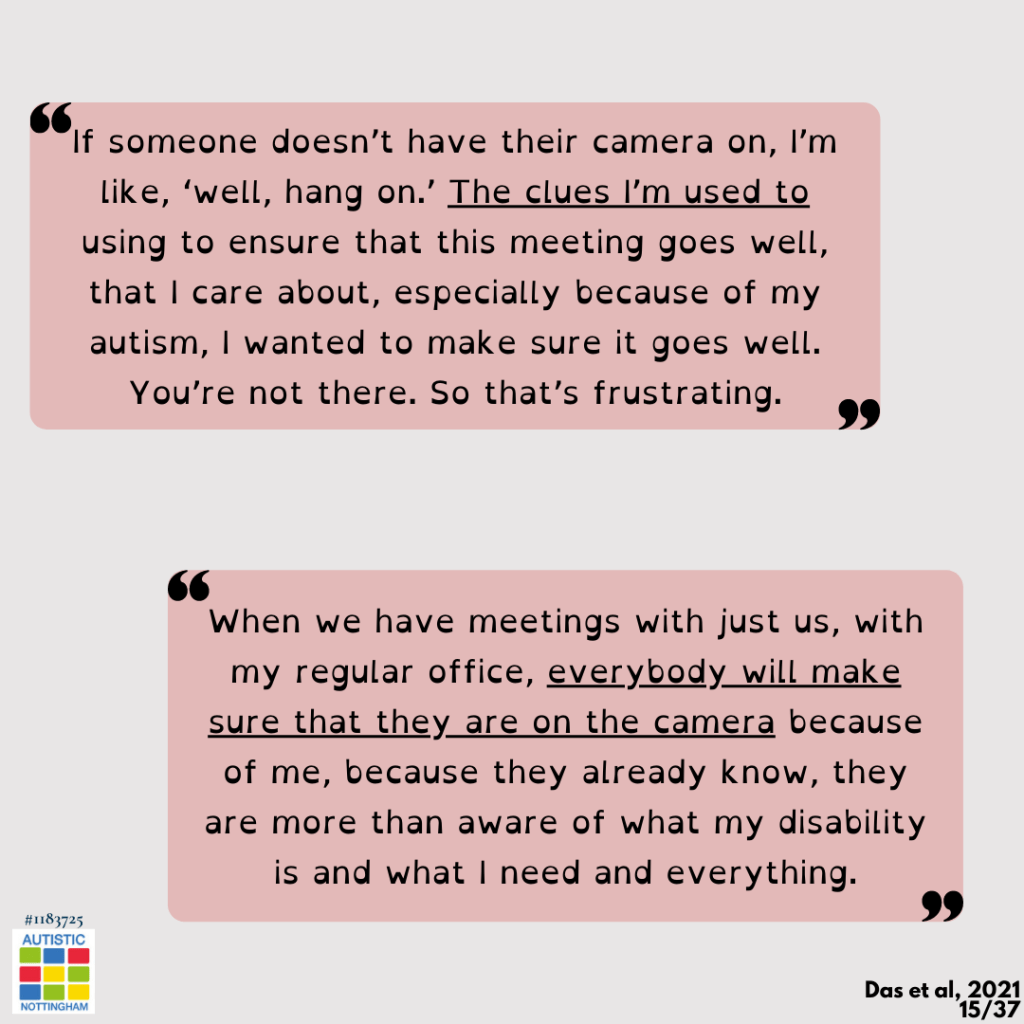 “If someone doesn’t have their camera on, I’m like, ‘well, hang on.’ The clues I’m used to using to ensure that this meeting goes well, that I care about, especially because of my autism, I wanted to make sure it goes well. You’re not there. So that’s frustrating.”