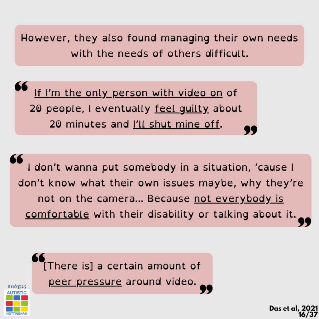 They had a variety of strategies to support themselves with distraction. Some preferred their videos on, some preferred them off, and some kept them on but covered their own image with a post-it or kept the screen minimised.